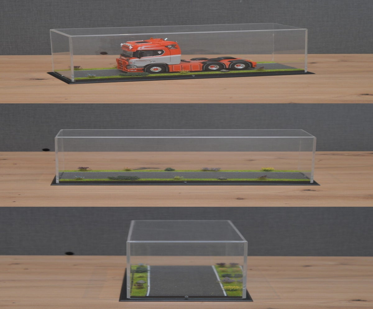 Bij Diorama Vitrines vind je handgemaakte dioramavitrines, speciaal ontworpen voor model vrachtwagens in schaal 1:50. Of je nu een losse trekker, trekker + trailer of een LZV combinatie wilt presenteren, onze strak afgewerkte vitrines met lichte groenstrook zorgen voor een rustige basis waarbij het model centraal staat.